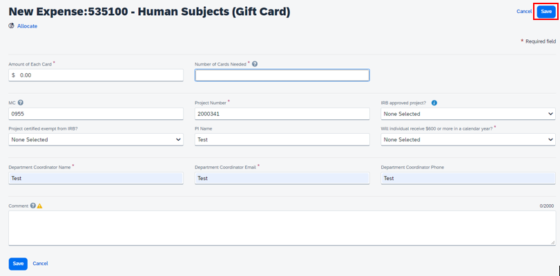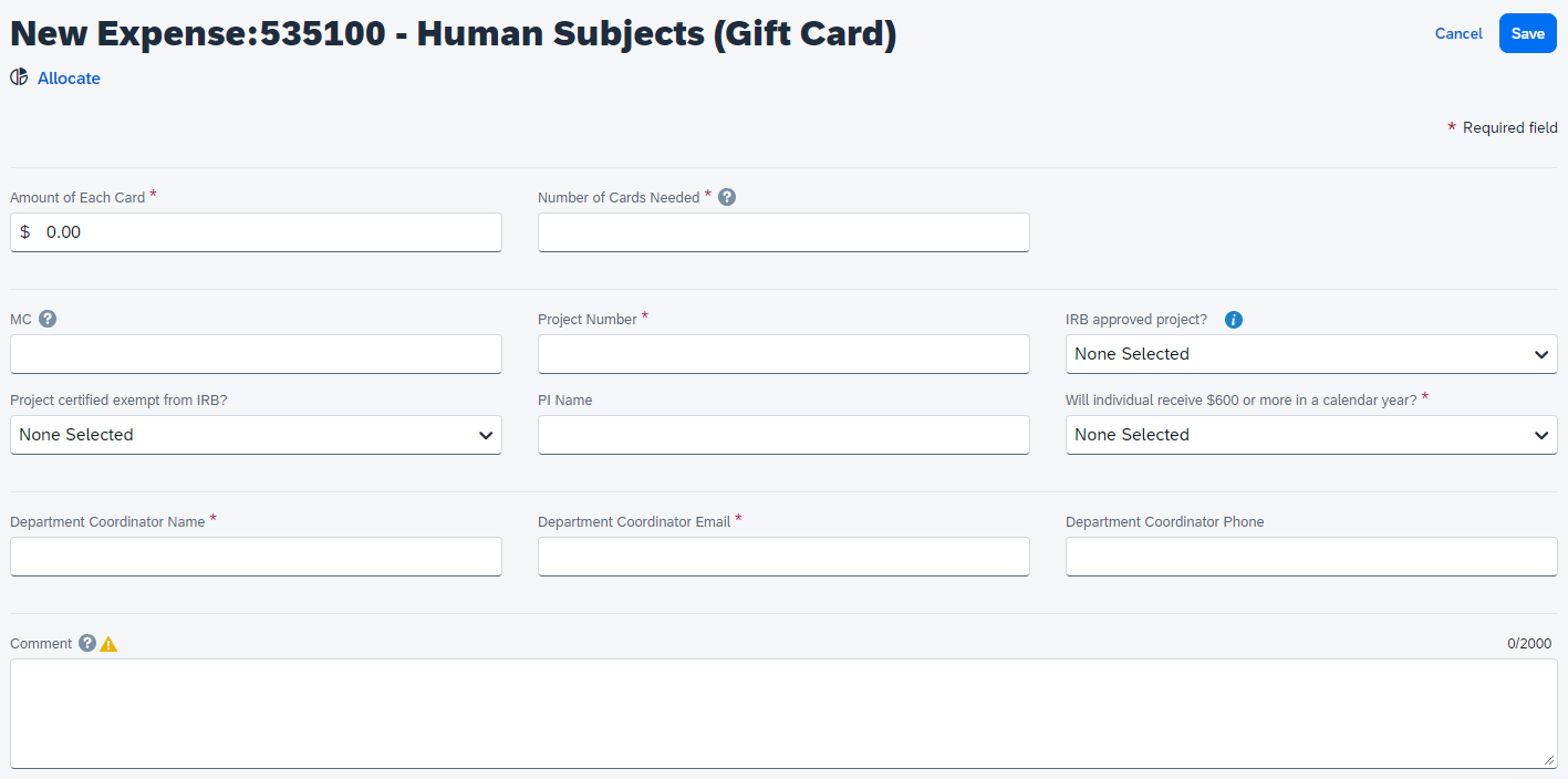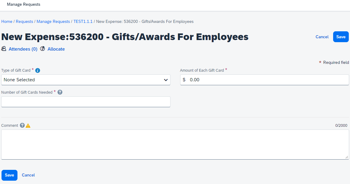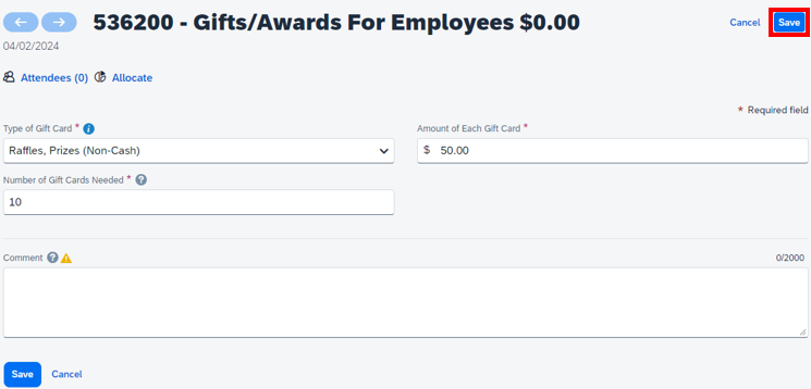 7. On the Expense tab, for Employee or Non-Employee Gift/Award, complete the following fields:
