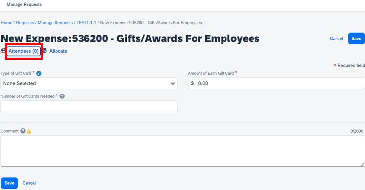 8. Add all Attendees, e.g. Gift Card recipients, to the Request.