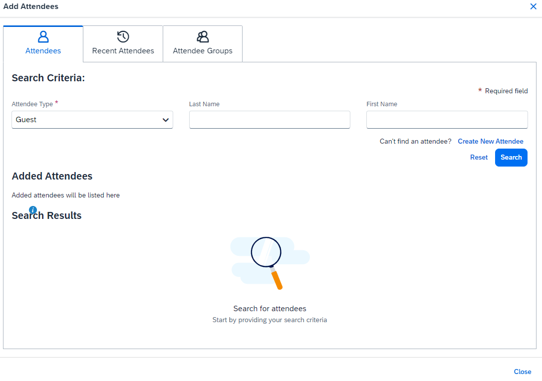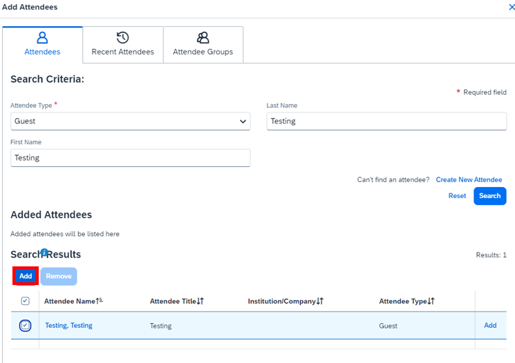 10. Choose an Attendee Type and fill out the needed fields, click Search.