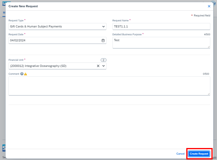 5. Click Create Request on the bottom right.