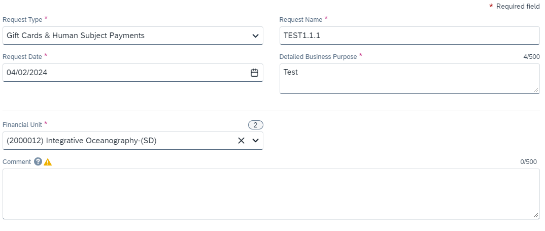 3. In the Request Header, in Request Type, select Gift Cards & Human Subject Payments.