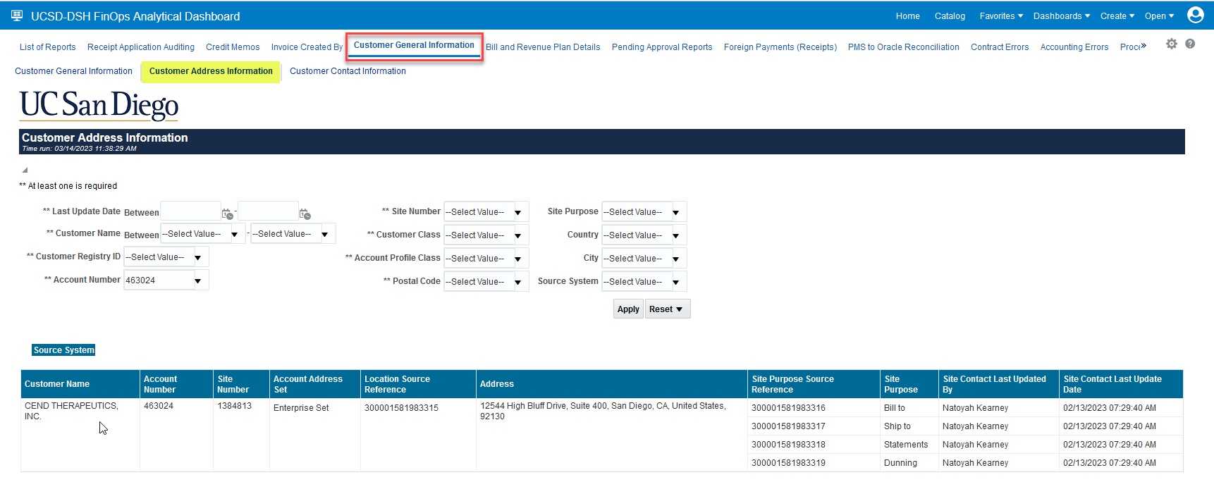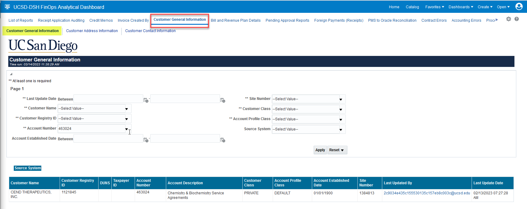 4. The UCSD-DSH FinOps Analytical Dashboard opens to the List of Reports tab > select Customer General Information.