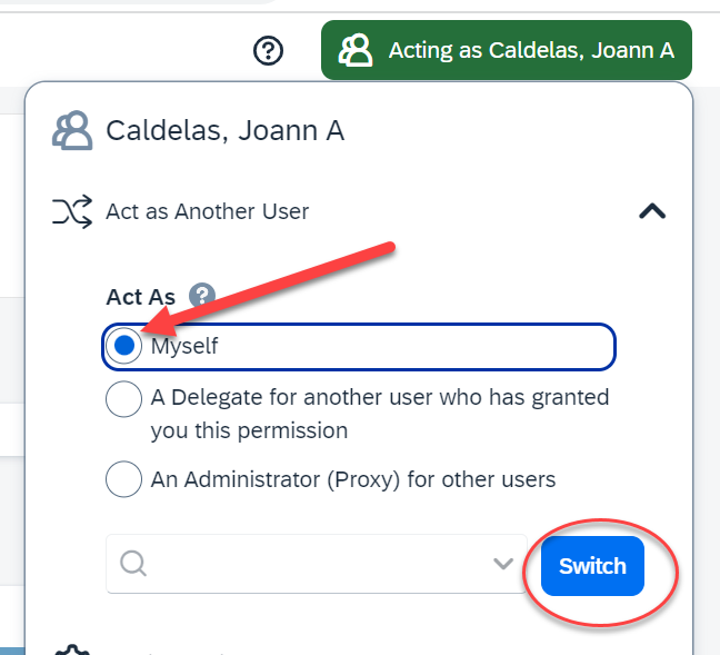 6. To stop Acting as another user, select the green Profile and select Myself, then select Switch.