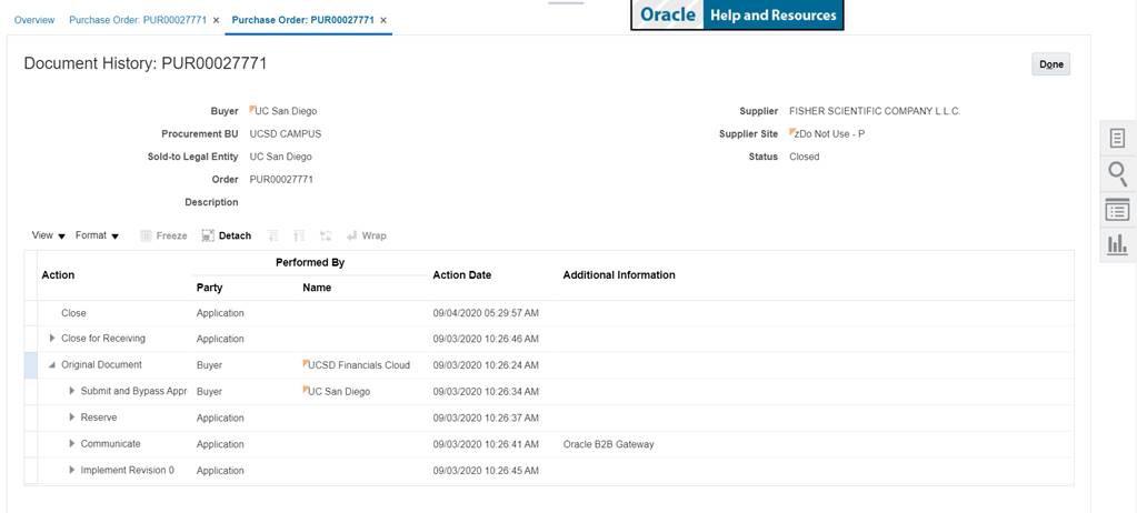 9. Once expanded, the Action Date displays when the PO was sent to the Supplier, the Oracle B2B Gateway indicates the PO was sent via an electronic integration.