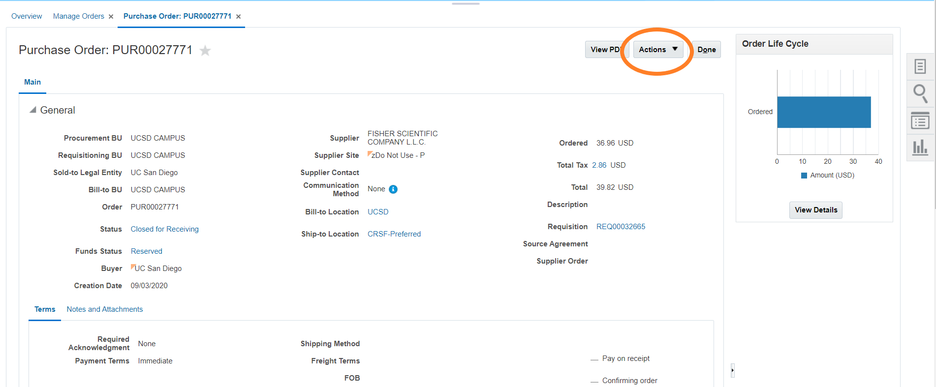 7. On the Purchase Order, in the upper right hand section, select the Actions tab, select View Document History.