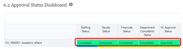 - Form 6.2 Approval Status Dashboard has 5 columns used to indicate budget progress status of Not Started, In Progress, Completed or Approved, which can be changed by Budget Users: