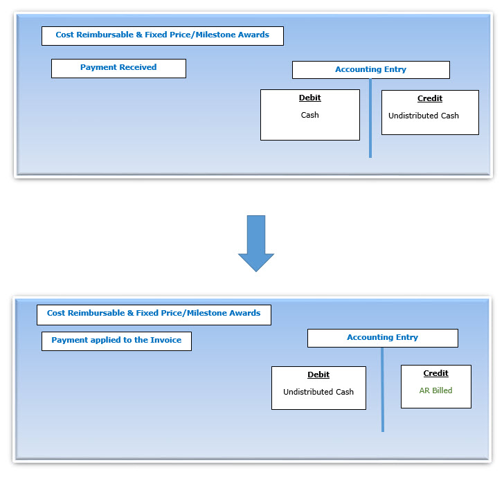 Project A (Cost Reimbursable): Debit: A/R Federal Grants Billed Credit: Undistributed Cash Project B (Fixed Price/Milestone): Debit: A/R Adv Billed Private Credit: Undistributed Cash