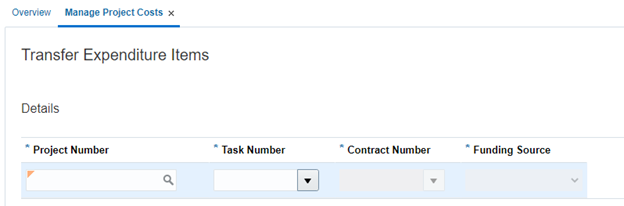 7. In the Transfer Expenditure Items page, enter the Project Number and Task Number you are transferring the cost to. For Sponsored Projects only, the Contract Number and Funding Source populates; if blank, choose the correct Funding Source from the drop down.