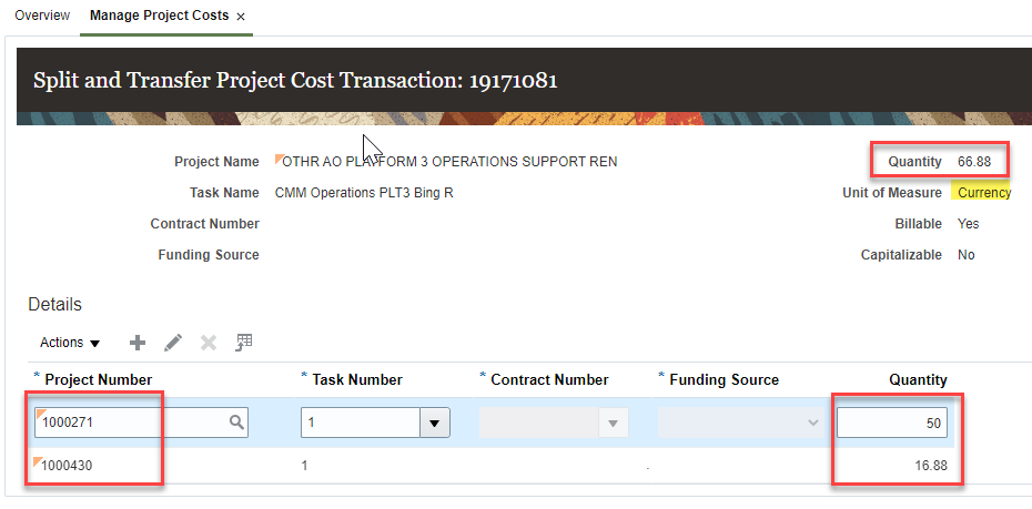 6. In the available rows, enter the Project/Task numbers and the split amount(s) for each project. The total amount of all lines must equal the Quantity field on the transaction. The Quantity is displayed in the transaction header.