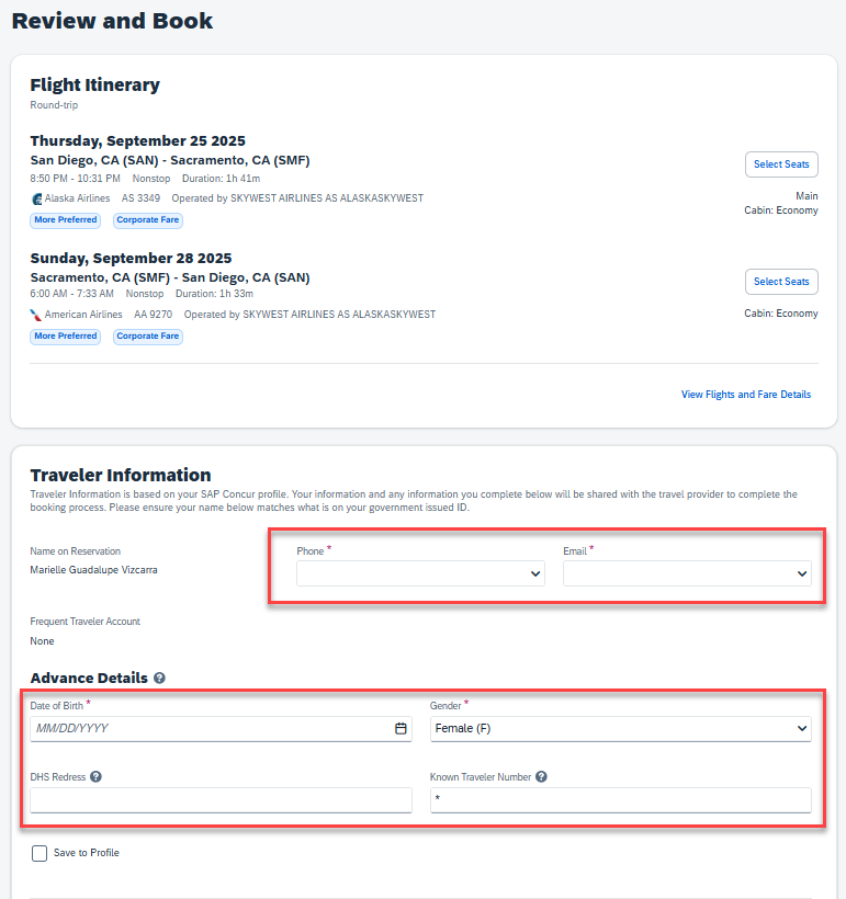 7. In the Review and Book section, review the flights that you selected, and this is where you will also enter the Traveler Information.