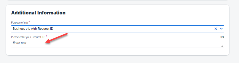 - If you select Business trip with Request ID, this is where you would enter your 4-digit Travel Request ID (refer to KB0032013 for information on creating a Travel Request).