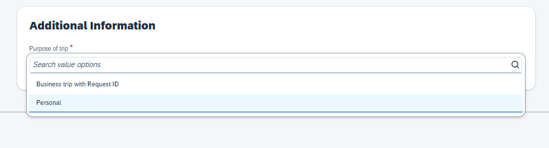 8. If you scroll down to the Additional Information section, this is where you would select if your trip was for a Business trip with Request ID or Personal.