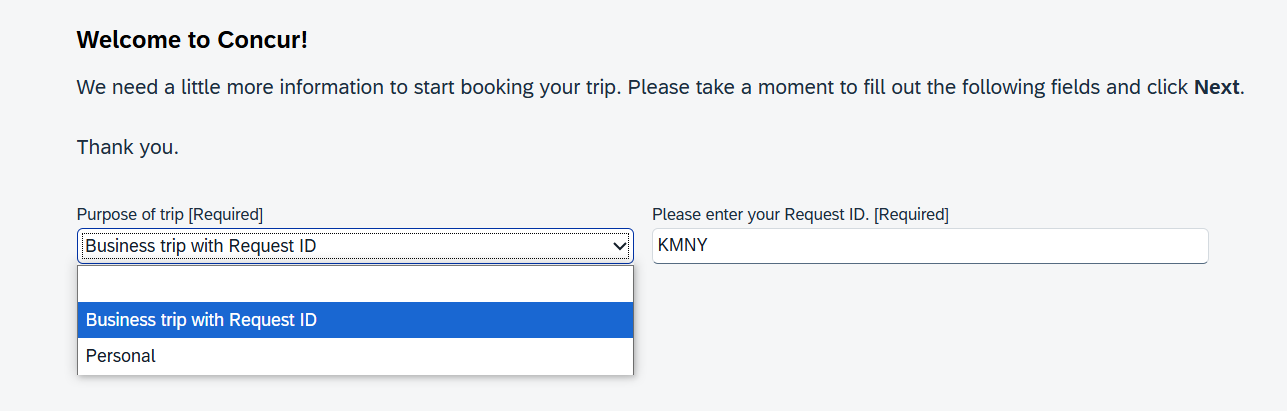 - Concur Travel can also be used for personal travel - in such a case, a Request ID isn’t necessary and you would just select Personal from the dropdown.
