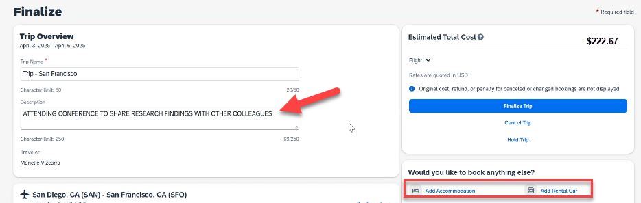 11. In the next page, you will add a description for your trip in the Trip Description field, and from this page you can also choose to add Lodging Accommodations and/or Rental Car if needed.