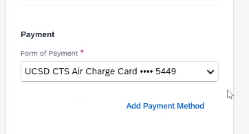 9. Ensure the UCSD CTS Air Charge Card (for airfare), or the Local Hotel Card (for local hotels) is selected as the method of payment.