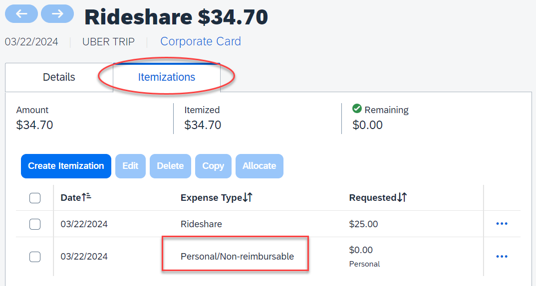 b. OR If only a partial amount of the card charge is Personal/Non-reimbursable, please use the Itemization feature to itemize the allowable expense and the personal/non-reimbursable expense.